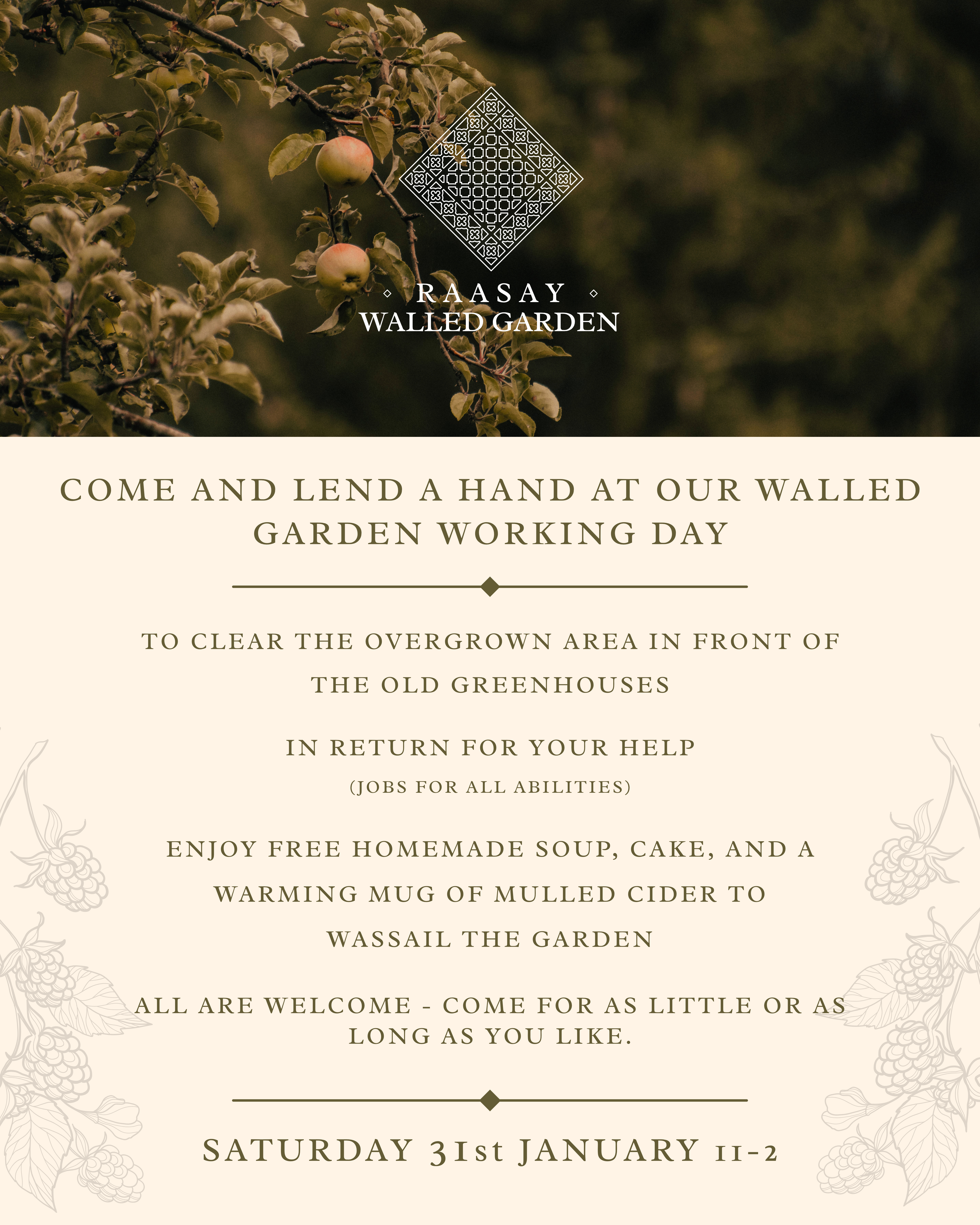 There has been a garden in this area since the 16 th century and it was well-stocked by the time Boswell and Johnson visited in 1773. An 1877 Ordnance Survey map shows the greenhouses in place and a layout very similar to that of today. However, from the 1980s the garden became overgrown and the greenhouses derelict. Fast forward to today and it is now a productive community garden thanks to the successful Raasay Roots, Shoots and Fruits project in 2017-18 and fundraising and much hard work since by a dedicated team of staff and volunteers who continue to develop and improve the garden every year.